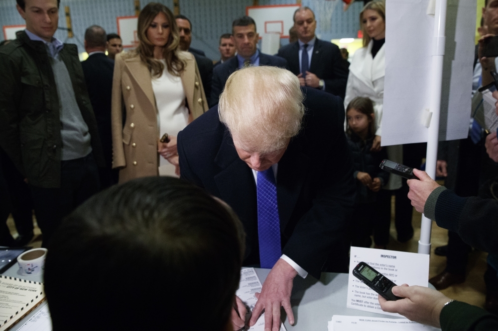 وكان المرشح الجمهوري يرتدي بدلة قاتمة اللون وربطة عنق زرقاء وبرفقة زوجته ميلانيا وابنته ايفانكا وأحد أحفاده، فصافح البعض وتوجه إلى كشك صغير لشراء قطعة حلوى من طفل كان يبيعها، قبل أن يدلي بصوته.