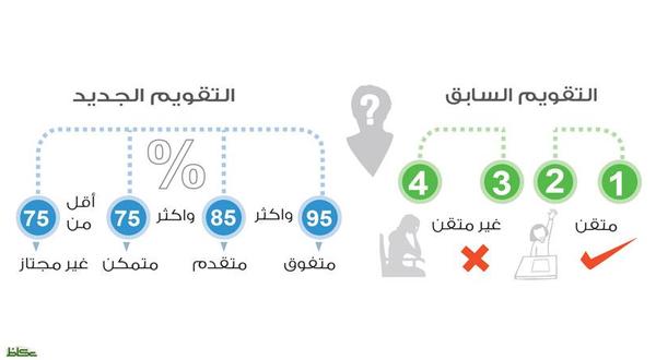 وتم تغيير طريقة التقويم من أتقن ولم يتقن إلى المعايير متقن للمعيار بنسبة 100% ومتقن للمعيار من نسبة 90% إلى أقل من 100% ومتقن للمعيار من نسبة 80% إلى أقل من 90% وغير متقن لأقل من 80% على أن تكون مستويات الأداء على النحو التالي: متفوق لمن أنجز 95% فأكثر ومتقدم لمن أنجز 85% إلى أقل من 95% ومتمكن لمن أنجز 75% إلى أقل من 85% وغير مجتاز لمن كان إنجازه أقل من 75%.