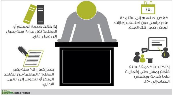 وكشفت مصادر لـ «عكاظ» أن المعلمين والمعلمات الذين يرجى شفاؤهم يعاملون، بأن يتقدم المعلم والمعلمة بطلب استدعاء لرئيس لجنة الظروف الخاصة، ويتم مخاطبة الهيئة الطبية لتشخيص الحالة الصحية، والتوصيات الطبية حيالها، وفي حالة تضمن قرار الهيئة الطبية تخفيض نصاب المعلم والمعلمة من الحصص، يخفض نصابهم إلى 50 % لمدة عام دراسي دون احتساب إجازات المرض ضمن تلك المدة، ويطالب المعلم والمعلمة بتقديم تقرير طبي في بداية كل فصل دراسي، وإذا استمر المرض بعد انتهاء العام الدراسي يعاملون معاملة المريض الذي لا يرجى شفاؤه، ويتم التعامل معهم بحيث إذا كانت خدمة المعلم أو المعلمة تقل عن 18 سنة يحول إلى عمل إداري، أما إذا كانت الخدمة 18 سنة فأكثر يعطون مهلة عامين دراسيين، ويخفض النصاب إلى 50 % بحيث لا تزيد خدمته مع المهلة المعطاة له عن 20 عاما، ثم يخيّر بعد ذلك بين التقاعد المبكر أو التحويل إلى العمل الإداري، على أن يتم تقييم الحالة الصحية لهم، عن طريق الهيئة الطبية العامة كونها الجهة المختصة بذلك.