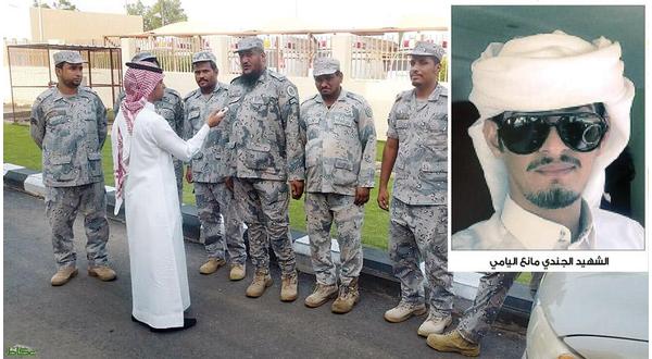 وقال قائد قطاع حرس الحدود بمحافظة الطوال العقيد صالح عبيد العمري «الجندي مانع اليامي كان من خيرة الأفراد بوقفته مع الجميع». وأضاف «يعلم الله أننا فقدنا أخا عزيزا وغاليا، وعزاؤنا وفخرنا أنه استشهد وهو يدافع عن ثرى وطننا الغالي، ونال شرف هذه الشهادة التي نحلم بها جميعا». وعبر العمري عن تعازيه لجميع زملاء الشهيد من أفراد حرس الحدود، مشيرا إلى أنهم سوف يكونون حصنا منيعا للدفاع عن حياض الوطن، مبينا أن رجال حرس الحدود بجانب أبطال قواتنا المسلحة يسطرون الملاحم البطولية للدفاع عن حدودنا الجنوبية، ويتصدون لكل من تسول له نفسه المساس بحدودنا الطاهرة.