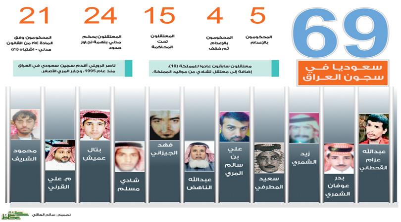 وينتظر الأهالي عودة أبنائهم بأسرع ما يمكن، سيما السجناء الذين انتهت محكوميتهم في العراق، وتأخرت عودتهم بسبب عدم وجود ممثلية للسعودية في بغداد، وعدم وجود من يتابع إجراءاتهم. بدورهما عبر المتحدثان باسم أهالي السجناء السعوديين في العراق عبدالله الناهض الحربي، والمهندس علي بن سعد القرني، عن أملهما في سرعة تواصل مسؤولي السفارة السعودية في بغداد مع السجناء السعوديين، خصوصا بعد انتهاء إجراءات عمل السفارة في العراق، وأكدا أن آمالهما كبيرة بإنهاء هذا الملف في أسرع وقت ممكن. «عكاظ» حصلت على آخر قائمة للسجناء السعوديين تم حصرها بشكل شبه رسمي، وهي القائمة التي ثبتت في السجلات الرسمية لوزارة العدل العراقية وتم تزويد الجهات الرسمية الحكومية بها، وتضم 69 سجينا سعوديا موزعين على عدد من السجون العراقية وأبرزها سجن الناصرية .. وفي ما يلي تنفرد «عكاظ» بنشر الأسماء مصنفة حسب الحكم الصادر بحق كل منهم: