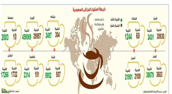 حجم استيراد البن من الخارج في ظل الطلب المتزايد على القهوة، يوفر للشباب السعودي أكثر من 18 ألف سيارة اقتصادية كورية الصنع، فيما يوفر المبلغ ذاته نحو 500 سيارة «رولز رويس» البريطانية الفارهة.