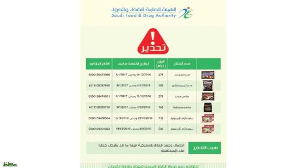 وأوضحت الهيئة في بيان على موقعها أن مركز الإنذار السريع للغذاء وإدارة الأزمات التابع للهيئة، رصد إنذارات صادرة عن عدد من الجهات الحكومية بدول الاتحاد الأوروبي بتاريخ 14/5/1437 الموافق 23/2/2016، كما تلقت الهيئة إشعارا من شركة مارس السعودية عن سحب شركة مارس بهولندا عددا من منتجات الشوكولاتة (سنيكرز، مارس، بيست أوف أور مينيز، ميلكي واي، سيليبريشنز) ذات المنشأ الهولندي، وذلك لاحتمال وجود قطع بلاستيكية مما قد يشكل خطرا على المستهلك.