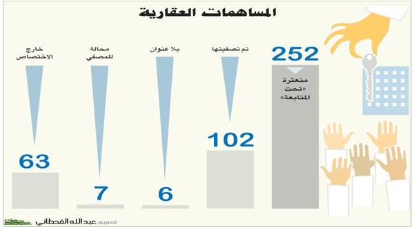 صنفت وزارة التجارة المساهمات العقارية المتعثرة إلى خمس فئات، مساهمات متابعة من اللجنة، وأخرى تمت تصفيتها، مساهمات بلا عنوان، ومساهمات محالة للمصفي، وخامسة خارج الاختصاص، وبلغ عددها 434 مساهمة. وعلمت «عكاظ» أن مساهمات بلا عنوان بلغت 6 مساهمات عقارية، في حين بلغ عدد المساهمات المتابعة من اللجنة 252 في 20 مدينة ومحافظة وبلغ عدد المساهمات المحالة للمصفي 7 في 4 مدن: مخطط الياسمين 11 في الرياض، مخطط العارض 13 في الرياض، درة الخليج في الخبر ، أرض شمال جدة، برج رواد الروضة في المدينة المنورة، أرض التقنية في الرياض، روضة أبحر في جدة وأوضحت وزارة التجارة أنها رصدت 63 مساهمة عقارية خارج الاختصاص في 25 مدينة ومحافظة، منها ما تجاوزت الحدود المحلية إلى دبي والشارقة، ومن أشهرها غابة ستي، أرض طريق الحرمين، مخطط منتزهات زهرة الربيع، أرض في عنيزة، مساهمات شمس الألوان في جدة، زهرة الربيع، بيتش تاور في جدة، أرض في تبوك حي الفيحاء، مضاربة في فلل، سوق مكة الدولي، مخطط الساحلى، مخطط الياسمين الثاني في الرياض، أرض شمال السليمانية في الرياض، أرض الجوهر في الرياض، فلل الجامعة في الدمام، الطحلاوية بالأحساء، أرض في العكيشية، وفي الشعيبة، أساطير دبي، أرض في حي السلام جدة، برج مركز دبي، أبراج الخليج بدبي، صناعية الشارقة، وحدات سكنية في مكة، فلل كورنيش الخبر، الحمودية بالخبر، حي قرطبة بالرياض، البابية شمال صياح بالرياض، أرض في المدينة، أرض على طريق الثمامة، بغلف بالرياض، وفي المعارض القديمة ووادي نمار بالرياض، وأرض شمال جدة خليج سلمان، مخطط المليساء ونيو جدة.