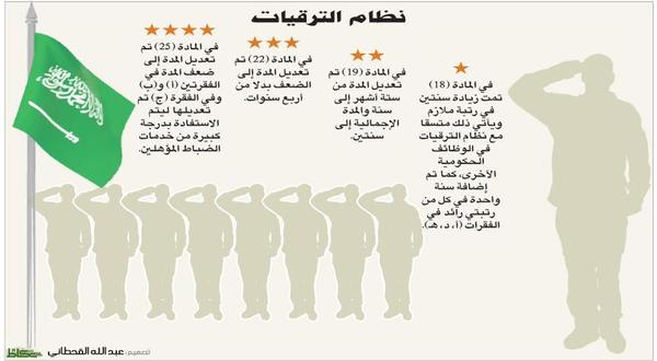 في المادة (18) تمت زيادة سنتين في رتبة ملازم ويأتي ذلك متسقا مع نظام الترقيات في الوظائف الحكومية الأخرى، كما تمت إضافة سنة واحدة في كل من رتبتي رائد في الفقرات (أ، د، ه).