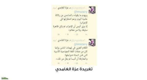 وأضافت الغامدي «والمفارقة أن أنيسا لم يقل عن تلك اللهجات إنها ركيكة لعدم اتباعها الإعراب المعياري، بل بدا ثائرا على صناعة النحاة لهذا الإعراب!».