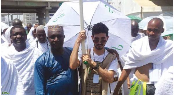 يسير الشاب عبدالله شراحيلي في شارع سوق العرب بمشعر منى رافعا لوحة إرشادية وخلفه نحو 200 حاج أفريقي متجهاً بهم إلى الجمرات ليعود مرة أخرى إلى المخيم في فترة زمنية محددة لا تتعارض مع حجاج آخرين.