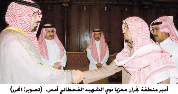 قدم صاحب السمو الملكي الأمير مشعل بن عبد الله بن عبد العزيز أمير منطقة نجران التعازي في وفاة الملازم أول حسين بن محمد القحطاني الذي استشهد البارحة الأولى إثر تعرضه لطلق ناري أمس الأول أثناء تأديته واجبه في التصدي لمروجي المخدرات.