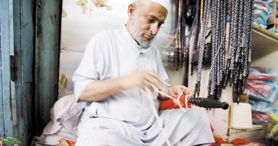 أربعون عاما والعم محمد الشافعي يحث خطاه يوميا بين أزقة وحارات البلد، ليأخذ مكانه في محله العتيق. ومنذ الصباح الباكر وحتى غروب الشمس تعيث يداه في الأقمشة الملونة ذات النقوش الغريبة، وتلف أصابعه الخيوط ليصنع تحفة فنية لا تتجاوز «لي» شيشة.