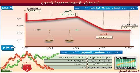 أنهى سوق الأسهم تداولاته للأسبوع المنصرم بانخفاض طفيف مقداره ثلاث نقاط، مقلصا الخسائر التي مني بها في جلسة الاربعاء والتي وصلت الى 34 نقطة وذلك بسبب ضغط كميات العرض على اسهم سابك والاتصالات وموبايلي، فيما شهدت السوق تحسنا جيدا في آخر الجلسة وقلصت خسائرها الى ثلاث نقاط بعد تزايد كميات الشراء على سهم سابك وانتعاش أسعار البترول التي انخفضت الى ما دون 74 دولارا للبرميل لكنها عادت وارتفعت الى فوق مستويات 74.4 دولارا.