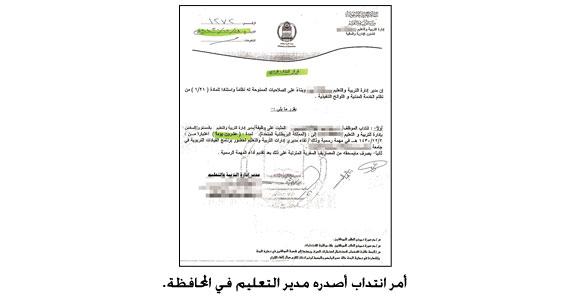 ووقع مدير التعليم على قرار انتدابه المكون من فقرتين؛ الأولى «انتداب الموظف (مدير التربية)، المثبت على وظيفة مدير إدارة التربية والتعليم بالمستوى السادس إلى ...»، والثانية أن «يصرف ما يستحقه من مصاريف سفرية مترتبة على ذلك بعد تقديم أداء المهمة الرسمية».