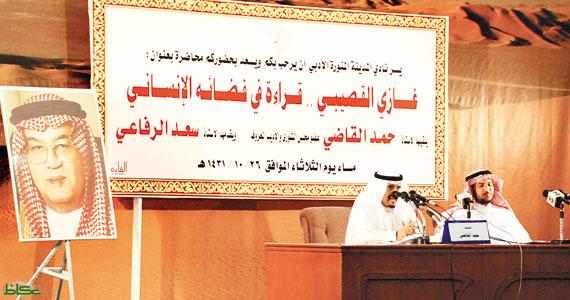 ويضيف القاضي في الحديث عن إنسانية غازي القصيبي قائلا: لاحظ الفقيد تدن في مستوى أحد العاملين لديه فطلبه، وعندما حضر إليه سأله هل توجد لديك ظروف أدت إلى تدني مستوى أدائك، فقال له الموظف إن زوجتي تعاني من مرض عضال، فقام الفقيد على الفور بصرف مبلغ مالي للموظف وأحضر له موافقة سامية لعلاج زوجته في الخارج وتكفل الفقيد بمصاريف أبناء الموظف طوال فترة علاج زوجته في الخارج. ويضيف القاضي: عندما كان الفقيد وزيرا كان يعمل لديه مستخدما في مكتبه، وبعد أن ترك الوزارة واتجه للعمل سفيرا للمملكة في المملكة المتحدة وبعد سنوات طوال قام الوزير بتزويج ابنته يارا وتفاجأ ذلك الرجل البسيط بوصول كرت دعوة لحضور الزفاف قام بإرسالها الفقيد له، وعندما استقبله يوم الزفاف كان استقباله له مثل استقباله للوزراء والمسؤولين. واختتم القاضي قصص الفقيد الإنسانية عندما كان وزيرا للصحة وقام بزيارة مفاجئة لأحد المستشفيات في المدينة المنورة وبعد دخوله المستشفى شاهد الوضع السيئ الذي كانت عليه وشاهد منظر الأطفال والنساء في حالة يرثى لها، حيث هم بالدخول إلى إحدى الغرف وأغلق الباب على نفسه ودخل في نوبة بكاء شديدة، وعلى الفور أصدر قرارا بنقل مدير المستشفى وطالب بتصحيح الوضع فورا ونقل المرضى والأطفال إلى مكان أكثر نظافة وعناية، فكان رد مدير الشؤون الصحية أنه من الصعب النقل الآن ولكنه غضب وقال لن أغادر حتى أوفر لهم مبنى بديل، وعلى الفور قام بالاتصال بمعالي وزير الحج آنذاك الشيخ عبد الوهاب عبد الواسع -رحمه الله - وطلب منه السماح بنقل المرضى إلى بعض المباني التابعة لوزارة الحج والتي لا تستخدمها في تلك الفترة حتى يتم توفير مكان آخر. وبعد ذلك بدأت المداخلات من الحضور والتي شهدت رواية بعض المداخلين لقصص واقعية مرت بهم مع الفقيد الذي قدم الكثير لوطنه وساهم بشكل كبير في إثراء الساحة الثقافية والأدبية بنتاجه الكبير الذي سيظل أرثا تتوارثه الأجيال القادمة. وهنا ننشر الجزء الأول من المحاضرة