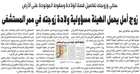 تصاعدت أزمة المواطن إبراهيم العنزي التي ولدت زوجته قبل أيام في ممر مستشفى الهيئة الملكية للجبيل وينبع، عندما بعث بخطابات شكوى للمقام السامي، رئيس الهيئة الملكية للجبيل وينبع، ووزير الصحة، ضد مستشفى الهيئة الملكية، يتهمها برفض استقبال زوجته بحجة عدم وجود سرير شاغر، رغم توقيع عقد رسمي بتوفير الرعاية الصحية لأسرته.