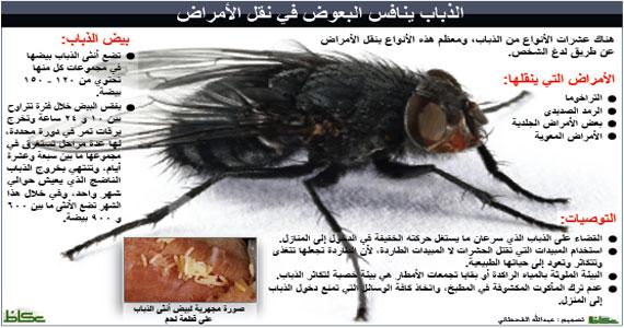 وأفاد «أن الذباب يمر بدورة حياتية مستغلة الظروف والعوامل البيئية المناسبة كالرطوبة ودرجة الحرارة الباردة، حيث تضع أنثى الذباب بيضها في مجموعات تحتوي كل منها على ما بين 120و 150بيضة، ويفقس البيض في خلال فترة تتراوح بين 10و 24 ساعة وتخرج منه يرقات تمر في دورة محددة لها عدة مراحل تستغرق في مجموعها ما بين سبعة وعشرة أيام، وتنتهي بخروج الذباب الناضج الذي يعيش حوالى شهر واحد، وفي خلال هذا الشهر تضع الأنثى ما بين 600 إلى 900 بيضة».