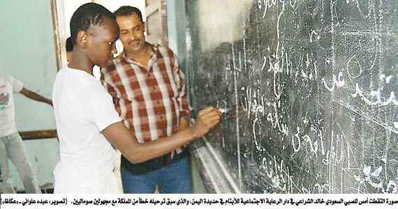 في المكان المخصص للأطفال في الدار استدعي الطفل خالد، وقبل الحديث معه أعطيته عدد «عـكاظ» المنشورة فيه صورة جده، توقف أمامها كثيرا وقال «هذا عبدالله» سألته هل تعرفه؟ أجابني «نعم، خالي ويسكن في قرية الحمى» التي لازال يحتفظ باسمها ويردده كثيرا، وعن كيفية وصوله إلى اليمن قال «خرجت من منزل أسرتي في الحمى وقبض علي مع أشخاص آخرين بالقرب من محافظة أبو عريش، ونقلت على أساس أنني صومالي في حافلة مع مجموعة من الأشخاص، إلى الترحيل وبقيت فيه عدة أيام قبل تسفيري إلى اليمن».