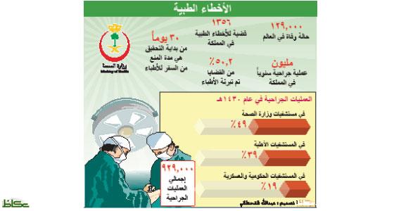 الأخطاء الطبية أصبحت هما لدى كثير من الأسر الباحثة عن العلاج وتحديدا تلك التي تخضع لعمليات جراحية، تقرير نشر العام الماضي وأعلنته وزارة الصحة وثق وفاة 129 شخصا نتيجة الأخطاء الطبية خلال عام واحد، كما بلغ عدد القضايا المعروضة على الهيئات الطبية في المملكة 1356 قضية، وبينت الوزارة حينها عن أن هناك 50.2 % من إجمالي قرارات الإدانة في الأخطاء الطبية تمت تبرئتها؛ أي أن نصف الممنوعين من السفر لم تتم إدانتهم.