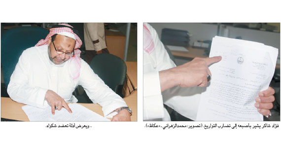 وقال شاكر، «بعد إبلاغي بقرار الفصل من العمل سارعت بتقديم مستندات للدفع بها أمام المخالفات الوظيفية التي وجهت لي وكانت السبب في إنهاء خدماتي»، وأضاف «أوضحت لشؤون الموظفين أن هناك تضاربا واضحا في التواريخ المدونة في قرار الفصل، حيث كان صدور القرار بالرقم الإداري 48450/2/ظ في 29/2/1427هـ في حين جرى تسجيل القرار في الصادر العام في 14/10/1426هـ، ما يعني أنني فصلت بقرار إداري جرى إبلاغ شؤون الموظفين وديوان الخدمة بنسخة منه لاتخاذ الإجراءات اللازمة حياله في تاريخ يسبق صدوره بثلاثة أشهر، فضلا عن التضارب الظاهر بين تواريخ المستندات التي على أساسها جرى إنهاء خدماتي».