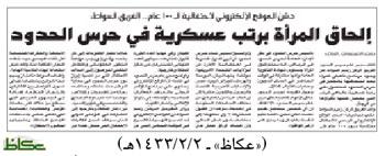 وقال السواط أمس إن عمل المرأة في حرس الحدود يقتصر على مجال التفتيش النسوي فقط في مطارات حرس الحدود في كل من البطحاء ، شبيطة ، عردة ، ذعبلوتن وأم الملح وفي المنازل والأماكن التي يوجد بها مهربات وفيها نساء مشتبه بهن داخل نطاق مسؤوليات حرس الحدود وكذلك في المنافذ وعبر موانئ جدة الإسلامي ، ينبع ، ضبا.
