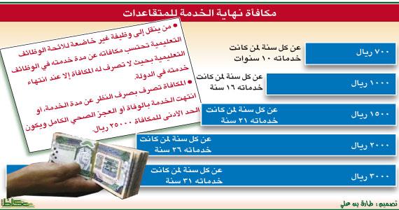 وتقول لائحة شاغلي الوظائف التعليمية المدرجة ضمن لوائح وزارة الخدمة المدنية والمعتمدة لديها نصا ومضمونا (أن تصرف لشاغلي الوظائف التعليمية عند انتهاء الخدمة مكافأة عن كل سنة كاملة من سنوات الخدمة التي قضيت على إحدى هذه الوظائف سواء قبل نفاذ اللائحة الحالية أو غير ذلك بحيث يحصل الموظف على 700 ريال عن كل سنة لمن خدمته 10 سنوات، و1000 ريال لمن خدمته 16 سنة، و1500 ريال لمن خدمته 21 سنة، و2000 ريال لمن خدمته 26 سنة، و3000 ريال لمن خدمته 31 سنة، ويشترط لصرفها أن يكون الموظف قد أمضى مدة لا تقل عن 10 سنوات على وظيفة أو أكثر من الوظائف التعليمية المعتبرة لصرف المكافأة، وأن تكون نهاية خدمة الموظف بعد نفاذ هذه اللائحة).