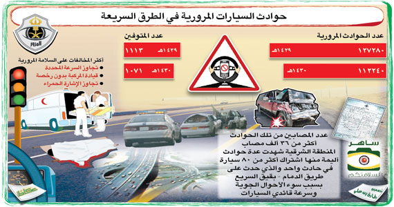 وكان تقرير إحصائي سابق للإدارة العامة للمرور أكد أن عدد الحوادث المرورية التي وقعت خلال عام 2009 في مختلف مناطق ومحافظات المملكة بلغت أكثر من 485 ألف حادث، راح ضحيتها 6485 شخصا، أي بمعدل 17 شخصا في اليوم الواحد.