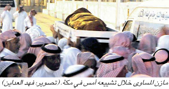 وقد شيعت جموع من المواطنين أمس جثمان الشاب مازن ناشي المساوى الذي كان معتقلاً بالسجون العراقية وأُعدم هناك قبل شهر، وقد ووري جثمان الفقيد في مقبرة المعلاة بعد الصلاة عليه عقب صلاة الفجر في المسجد الحرام، واستقبل ذوو الفقيد جموع المعزين بعد أن توافدوا للمقبرة لتشييعه. وبدت على وجوه المشيعين حالة من الحزن لفقد الشاب مازن، وأعرب أحد أقاربه عن حزن والده الشديد لفراقه، داعياً الله أن يتقبله بالرحمة والمغفرة وأن يسكنه فسيح جناته، مشيراً إلى أن الفقيد كان حريصاً على فعل الخير والحث على العمل به والمثابرة في صلة الرحم، مبيناً أنه كان يحترم الصغير قبل الكبير وكان الأخ الحنون على جميع أفراد عائلته، مضيفاً آلمنا خبر إعدام مازن في العراق وكان كالصاعقة على مسامعنا، ولكن مشيئة الله فوق كل شيء ولا راد لقضاء الله، سائلاً المولى عز وجل أن يتغمده بواسع رحمته وأن يسكنه فسيح جناته.