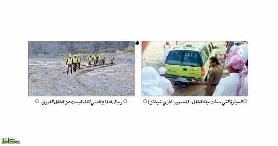 من جهته أوضح المتحدث الإعلامي بالدفاع المدني الرائد عبدالرحمن الغامدي أنه تم العثور على الطفل زياد السلمي أمس داخل عقم مخصص لتجميع مياه الأمطار والسيول وهو تابع لمزرعة على ضفاف وادي ساية وقد تم البحث فيها من قبل الدفاع المدني المخصصة لهذه المهمة وتم انتشال الجثة تمهيدا لإكمال الإجراءات النظامية لتسليمه لذويه.