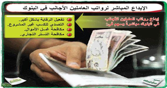 أكد مصدر في وزارة العمل أن تطبيق خطة إيداع رواتب العمال hلوافدين في البنوك مباشرة من خلال شركات القطاع الخاص لربط راتب العميل المودع او حصيلة رواتبه المتراكمة بمجموع تحويلاته الشهرية و السنوية سوف يسهل الرقابة ومحاربة طرق الكسب غير المشروع وعمليات مكافحة غسل الاموال ومكافحة التستر التجاري.