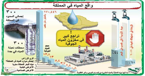 وبين أن إجمالي موارد المياه في المملكة من المياه بما فيها مياه التحلية والمياه المكررة من الصرف الصحي، وغير التقليدية تبلغ سنويا خمسة بلايين و400 مليون متر مكعب، فيما تبلغ موارد تحلية مياه البحر سنويا حوالى 3.7 بليون مترمكعب، ويصل حجم المياه الجوفية التي تناقصت بشكل كبير حوالى 13.8 بليون متر مكعب، فيما تستخدم المملكة سنويا حوالى 13 بليون متر مكعب للري الزراعي و2.4 مليون متر مكعب للأغراض البلدية و800 مليون متر مكعب للأغراض الصناعية.