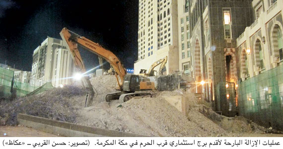 دكت معدات القطع الصخري أقدم برج استثماري مقابل للحرم المكي من الجهة الجنوبية التي تعتبر أغلى منطقة استثمارية في الكرة الأرضية، حيث يصل سعر المتر الواحد إلى 800 ألف ريال.