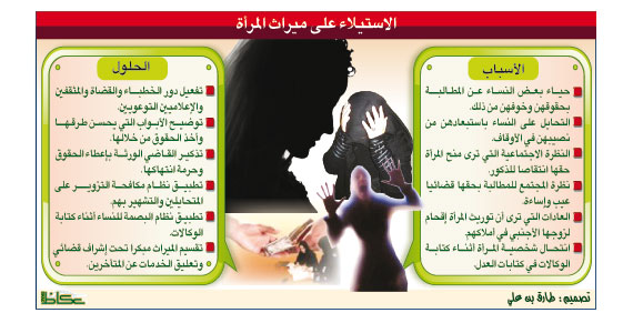 وأوضحوا أن عددا ممن يمارسون هذه التجاوزات يحاولون بطرق معينة التحايل على حق المرأة في الميراث إما بسلب حصتها أو استغلال جهل بعضهن بحقوقهن وإكراههن على التنازل بثمن بخس.