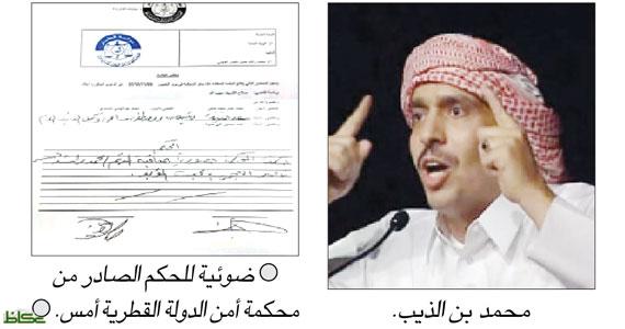 أصدرت محكمة أمن الدولة القطرية، صباح أمس، حكما بالسجن المؤبد على الشاعر محمد بن الذيب بتهمة التطاول على رموز دولة قطر، والتحريض للإطاحة بنظام الحكم عبر قصيدة رد بها على الشاعر خليل الشبرمي.