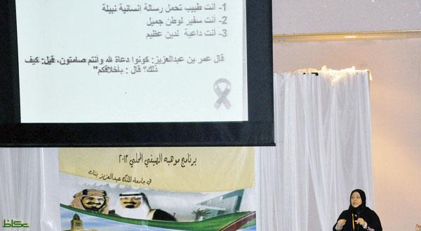 وقالت خلال ملتقى الدورة الخاصة بالمستجدين من طلبة وطالبات الطب في محاضرة عن أخلاقيات مهنة الطب «الطب لا يحتاج لعبقرية وإنما يحتاج للإنسانية، وأساس علاقة الطبيب بزميله والطبيب بالمرضى هو الاحترام».