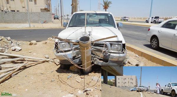 ارتطمت سيارة شاب بعمود كهرباء في حي الخالدية بمحافظة الوجه ما أدى لتهشمها وسقوط العمود وانقطاع التيار الكهربائي عن الحي لفترة من الوقت.