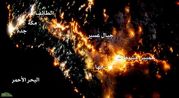 وقال المهندس ماجد أبوزاهرة رئيس الجمعية الفلكية بجدة «إن الصورة تظهر مجموعة من الغيوم تغطي بعض المناطق جزئيا ولطخات من أضواء المدن خاصة قرب خميس مشيط وأبها، فيما تظهر مراكز براقة لثلاث مدن في أعلى يسار الصورة وهي لمدن جدة، مكة المكرمة والطائف».