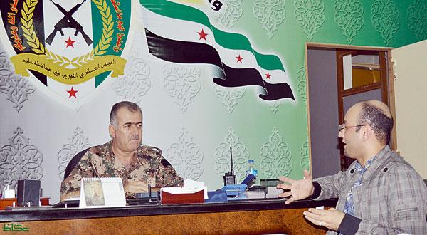 بين أسئلة الضربة الأمريكية العقابية ضد نظام بشار الأسد، ومراوغات النظام بتسليم أسلحته الكيماوية لينجو من الضربة وانشغال العالم بأسره بالأزمة السورية، وبين أحاديث المجازر اليومية في سوريا وألم الحياة اليومية، اخترقت «عكاظ» العمق السوري لتصل إلى قلب حلب بعد المرور بريفها، حيث المعارك التي لا تهدأ، وهدير طائرات «الميغ»، وأزيز الرصاص في كل زاوية، لتلتقي مهندس العمليات العسكرية (قائد المجلس العسكري) في حلب العقيد عبدالجبار العكيدي.