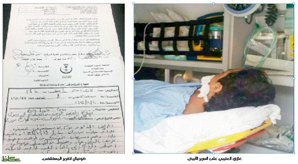 وكشف تقرير طبي عن حالة المريض من مستشفى عفيف (حصلت «عكاظ» على نسخة منه) أن المريض غازي العتيبي نوم في مستشفى عفيف في 14 شوال 1434، وتبين وجود خدوش في الوجه ونزيف حاد بالبطن، وهبوط في الضغط، ما اضطر الجراح إلى إجراء عملية جراحية عاجلة، وهي عبارة عن استكشاف للبطن، مع العلم بأنه أصيب في حادث مروري سابق وتم فتح بطنه وإزالة الطحال.