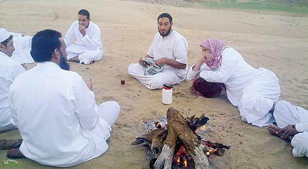 أما أم فيصل فإنها تخيم في الأماكن الأكثر تشربا بمياه الأمطار مثل الأودية والجبال المتناثرة ما بين قلوة وأضم، وتقول ننتقل بالحلال «الإبل والغنم» إلى حيث توجد المراعي الخضراء، ويمر على خيمتنا عدد ليس بالقليل من المارة بأطفالهم، فنقدم لهم حليب الإبل الطازج، وفي فترة العصر تلتحق بنا باقي العائلة فنذبح الذبائح ونطهوا الطعام في الهواء الطلق بعيداً عن أبواب المنازل المغلقة خلال موسم الغبار والأتربة.