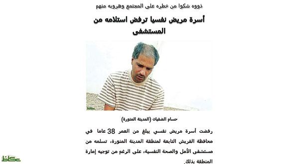 إلى ذلك، أكد حسين الصيفي شقيق المريض النفسي يوسف أن وجود أخيه خارج المستشفى يشكل خطورة كبيرة على حياته أولا ثم على من حوله من خلال الانفعالات التي يحدثها والتصرفات الخطرة التي يقوم بها.