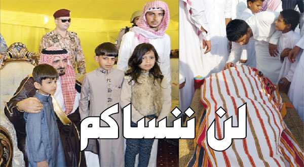 من جهة ثانية، ونيابة عن صاحب السمو الملكي الأمير محمد بن نايف بن عبدالعزيز وزير الداخلية، قدم مساعد وزير الداخلية الفريق أول سعيد القحطاني أمس، واجب العزاء لذوي شهيد الواجب العميد عودة معوض البلوي في محافظة أملج، سائلا الله عز وجل أن يتغمد الفقيد برحمته وأن يسكنه فسيح جناته وأن يلهم أهله وذويه الصبر والسلوان.