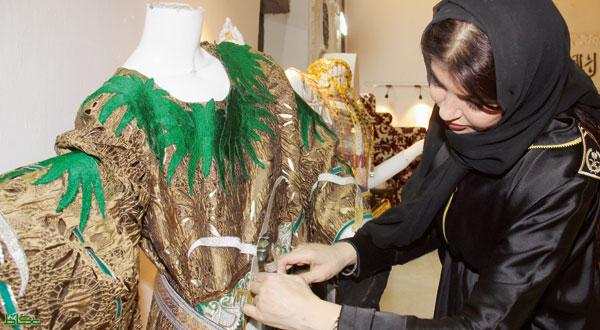 وأضافت أن السيدة بإمكانها أن تواكب العصر والتطور بمختلف الأقمشة الفخمة كالمخمل والدانتيل والحرير، وهي تعطي الشموخ للسيدة في إطلالتها.
