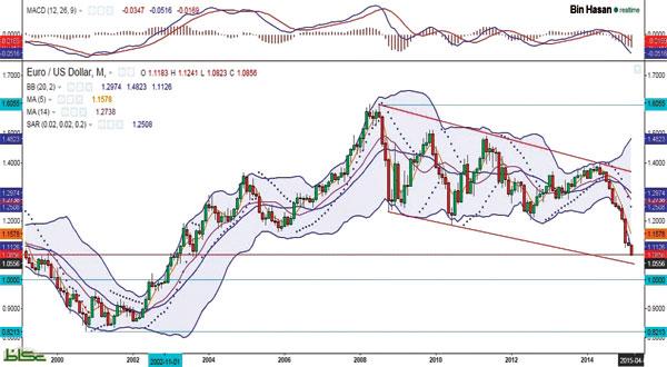 واستعرض وصول اليورو إلى أعلى نقطة قياسية في تاريخه أمام الدولار خلال شهر يوليو من عام 2008 م، عندما وصل إلى مستوى 1.6037 دولار؛ قبل هبوطه التدريجي طوال السنوات السبع الماضية، أعقبها بمسلسل هبوط سريع في الأشهر الأخيرة.