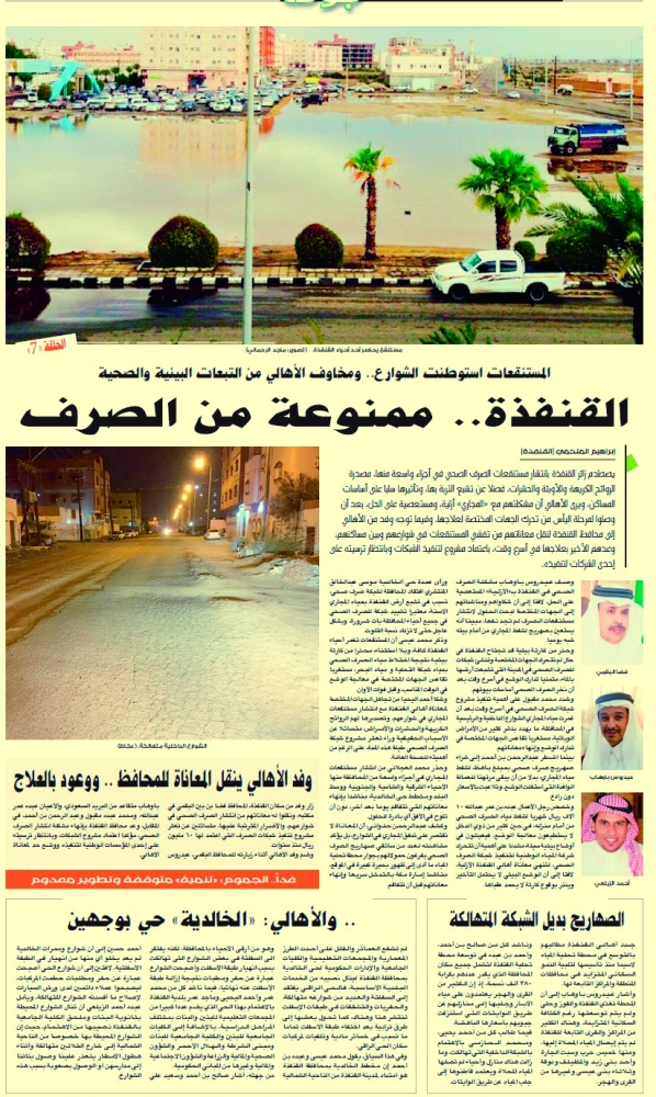 وكانت «عكاظ» نشرت شكاوى أهالي القنفذة وزائريها من انتشار مستنقعات الصرف الصحي في أجزاء واسعة منها، مصدرة الروائح الكريهة والأوبئة والحشرات، فضلا عن تشبع التربة بها وتأثيرها سلبا على أساسات المساكن. ورأى الأهالي أن مشكلتهم مع «المجاري» أزلية، ومستعصية على الحل، بعد أن وصلوا لمرحلة اليأس من تحرك الجهات المختصة لعلاجها.