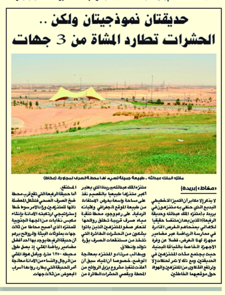 وأوضحت أمانة القصيم تعليقا على ما نشرته «عكاظ» بعنوان «حديقتان نموذجيتان في بريدة ولكن.. الحشرات تطارد المشاة من 3 جهات»، في (1437/11/22) أن إدارة صحة البيئة التابعة لها تطبق برنامجا عمليا لمكافحة البعوض وفق آلية علمية، ويشرف على البرنامج كادر متخصص في أعمال المكافحة.