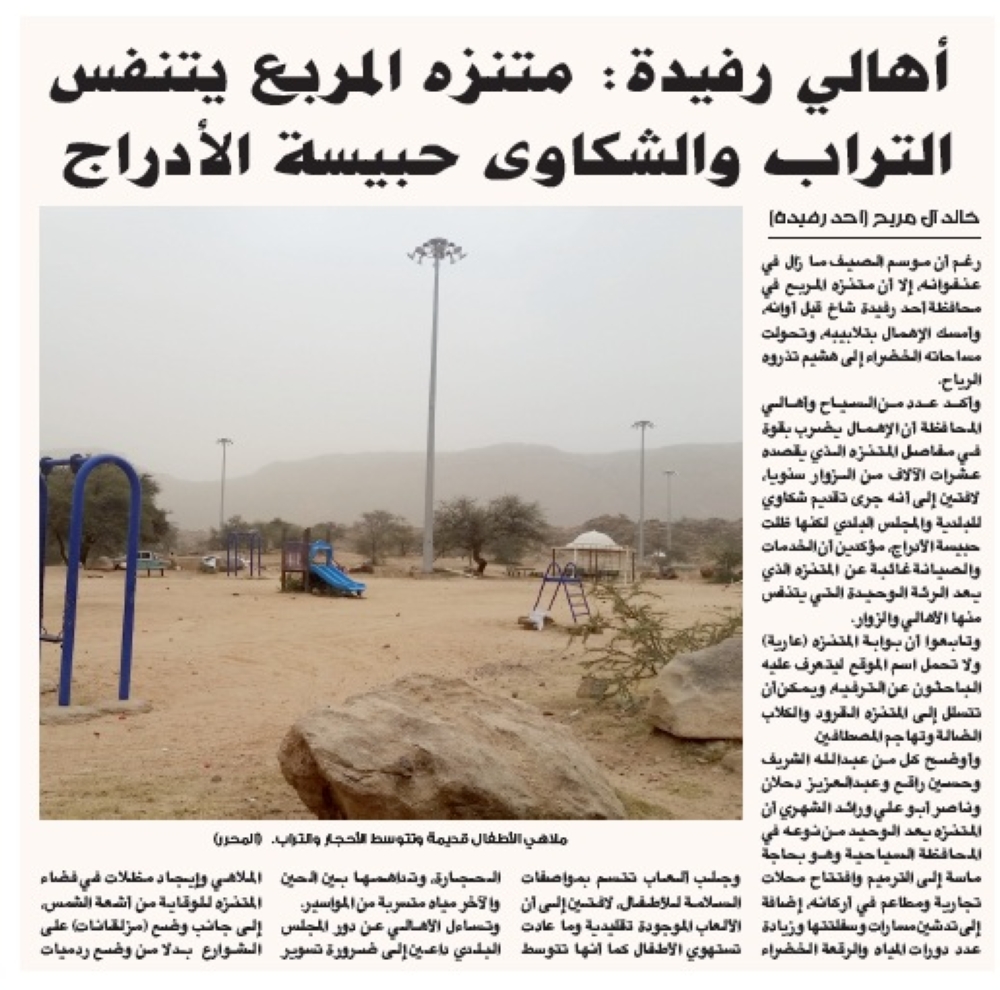 وكان عدد من السياح وأهالي المحافظة انتقدوا في حديثهم لـ«عكاظ» إهمال بلدية أحد رفيدة للمتنزه، لافتين إلى أنهم تقدموا بشكاوى عدة للبلدية والمجلس البلدي لتدارك ما اعتبروه إهمالا، إلا أن مطالبهم ظلت حبيسة الأدراج -على حد قولهم.