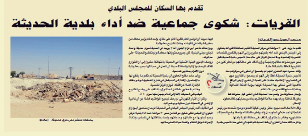 وكان أكثر من 50 مواطنا في مركز الحديثة التابع لمحافظة القريات، تقدموا بشكوى إلى المجلس البلدي ضد أداء بلديتهم، مشيرين إلى أنهم يفتقدون للخدمات التنموية الأساسية، وبقاء مدخل المركز على حاله منذ تأسيس بلدية الحديثة قبل نحو سبع سنوات، مطالبين بلجنة وزارية تقف على معاناتهم مع تعثر كثير من المشاريع المتعلقة بالبنية التحتية.