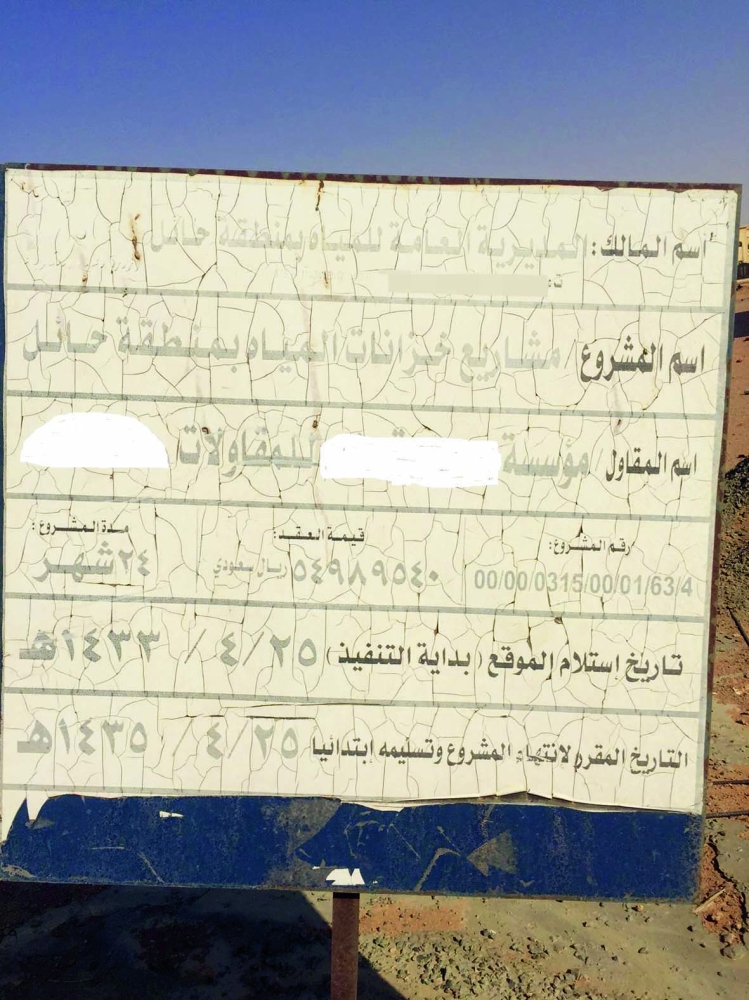 مر نحو ثلاثة أعوام على موعد تسليم مشروع خزانات المياه في محافظة الشملي في منطقة حائل، دون أن ينجز، ما أثار استياء الأهالي الذين أنهكهم العطش، خصوصا حين يمرون بلوحة المشروع، التي تفيد بموعد التسليم في الـ25 من ربيع الآخر 1435، وكلفته تبلغ نحو 55 مليون ريال.