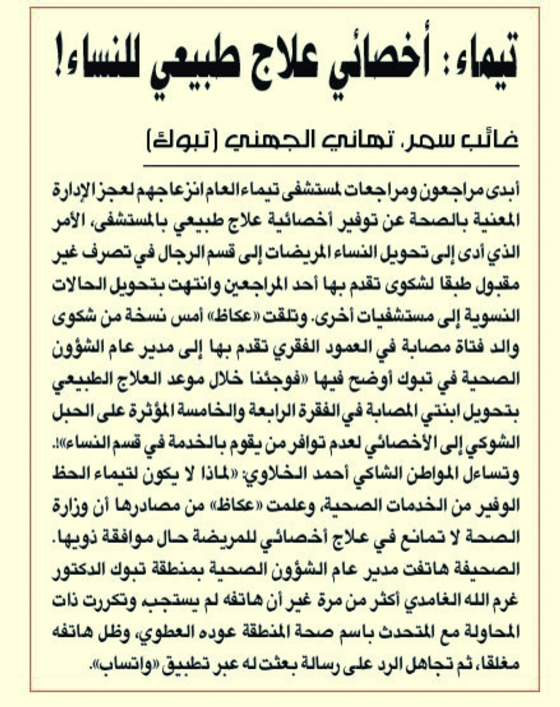 وكان مراجعون ومراجعات لمستشفى تيماء العام أبدوا لـ«عكاظ» انزعاجهم من عجز الإدارة المعنية بالصحة عن توفير أخصائية علاج طبيعي بالمستشفى، الأمر الذي أدى إلى تحويل النساء المريضات إلى قسم الرجال في تصرف غير مقبول، طبقا لشكوى تقدم بها أحد المراجعين وانتهت بتحويل الحالات النسوية إلى مستشفيات أخرى.