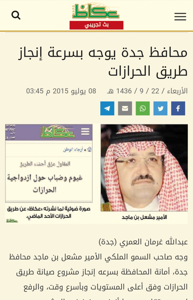 لم تكتمل فرحة سكان الحرازات (جنوب شرق جدة) بتوجيهات محافظ جدة الأمير مشعل بن ماجد، التي أصدرها للأمانة في رمضان 1436، بسرعة إنهاء معاناتهم مع الطريق العام الذي يربطهم بحي كيلو 14، إذ وجه المحافظ آنذاك بسرعة إنجاز صيانته وإنارته وفق أعلى المستويات، حقنا لدماء العابرين، إلا أن الأهالي يرون أن الشركة المنفذة انسحبت دون أن تنهيه، فرحلت بعد أن سفلتت الطريق وركبت أعمدة إنارة، لم تزود بالتيار، ولم تضأ منذ نحو عام ونصف، مطالبين أمانة جدة بأن تتحرك سريعا وتكمل المشروع بتنفيذ ازدواجيته وإنارته.