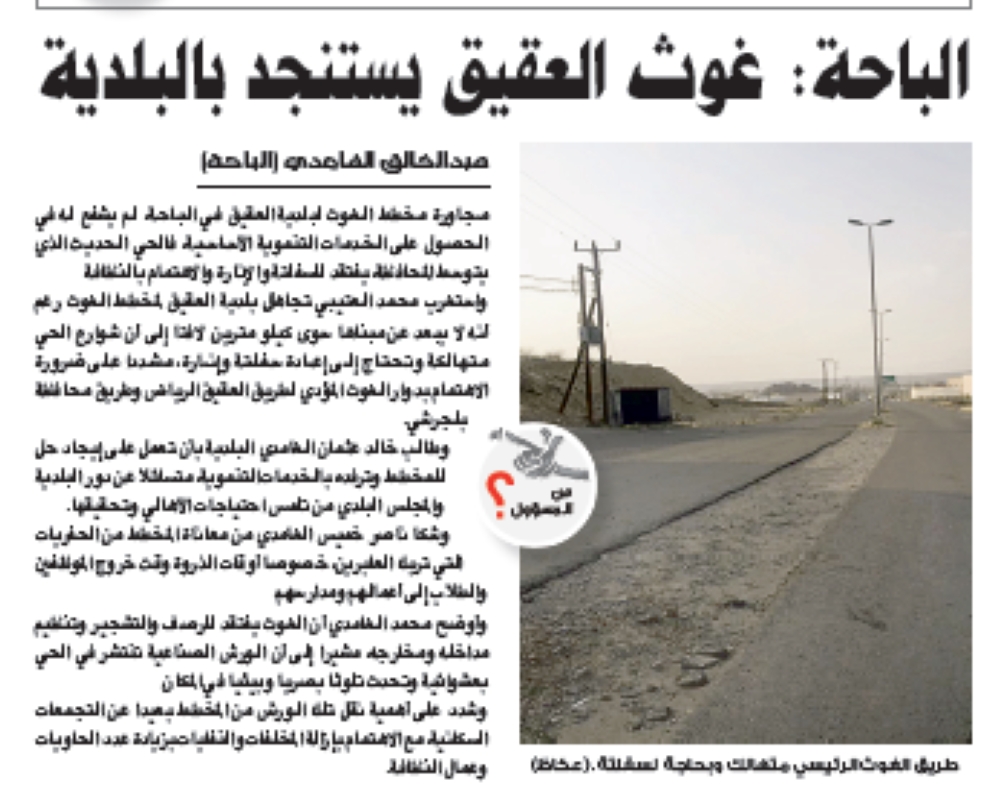 أوضحت بلدية العقيق في الباحة أنها سفلتت وأنارت غالبية شوارع مخطط الغوث بدءا بطريقه المزدوج، رغم أنه حي سكني عشوائي قديم، وليس معتمدا، لافتة إلى أنها زودته بالخدمات وتجري دراسة لإعادة سفلتة الطرق المتهالكة في الحي.