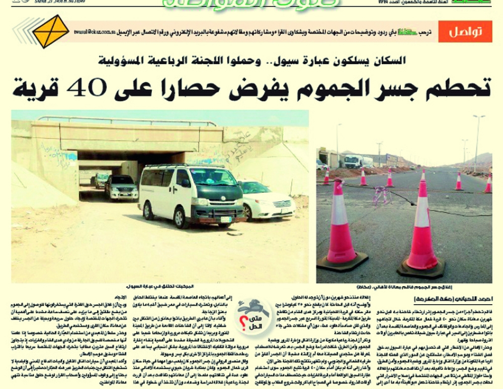 وكانت «عكاظ» نشرت معاناة سكان نحو 40 قرية شمال مكة المكرمة من تحطم أجزاء من جسر الجموم إثر ارتطام شاحنة به، مشيرين إلى أنهم يجدون صعوبة خلال توجههم إلى المدارس والجامعات والوظائف في الجموم والعاصمة المقدسة، بعد أن باتوا مضطرين إلى السير في عبارة سيول ضيقة، تغص بالعابرين أوقات الذروة صباحا وظهرا.